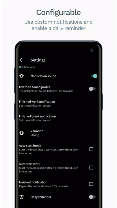 用户可以设置不同的铃声来区分工作与休息时间,增加使用的乐趣和个性化体验。还可以开启持续通知,确保及时提醒。
