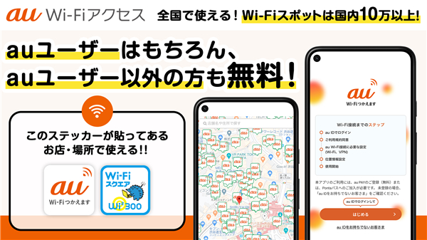 • Whether you’re an au user or not, you can enjoy safe, high-speed Wi-Fi for free through the au Wi-Fi Access app.