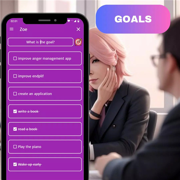 Set personal goals, monitor your progress, and receive reminders to keep you on track. Zoe helps you stay focused and motivated to achieve your aspirations.