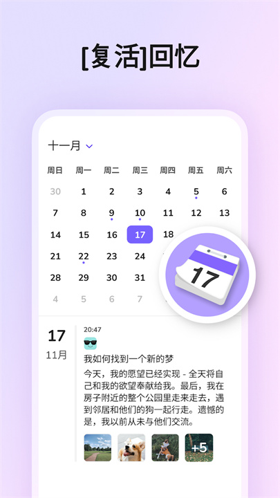 而且应用还提供每日提醒功能,帮助您养成写日记的好习惯,及时记录生活中的点滴。我的日记不仅适合日常反思,也可以作为感恩日记,提醒您每天发生的美好事物。借助日历功能,您可以制定计划,记录课程、约会或其他重要事件,确保生活井然有序。