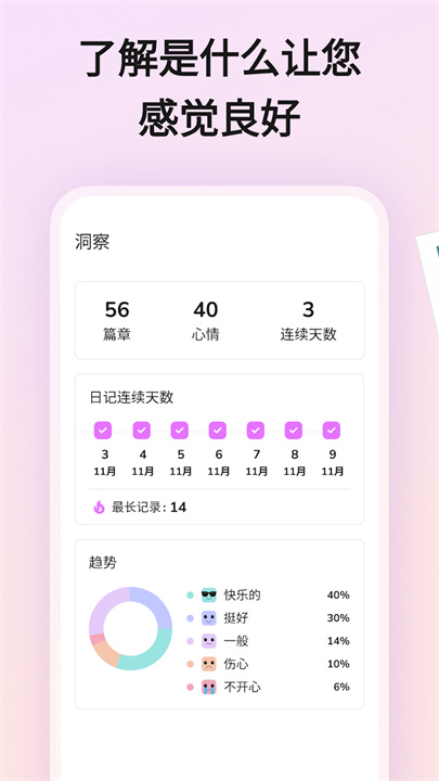 应用内置心情记录工具,让您每天记录情绪,帮助您更好地理解自己的感受和经历。所有的喜怒哀乐,生活中的酸甜苦辣,您都能轻松记录。