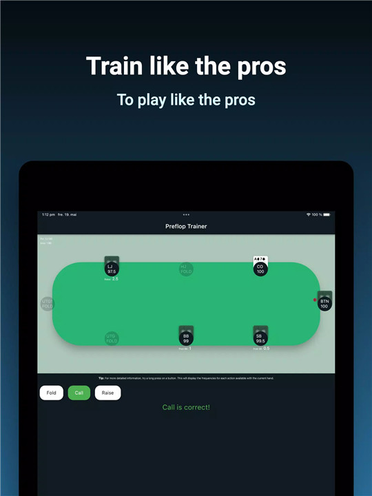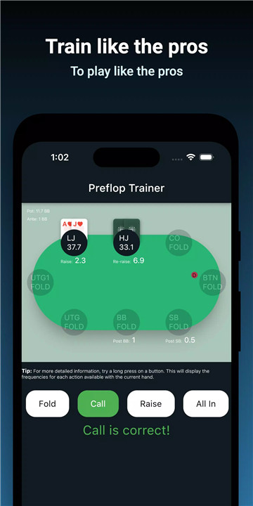Professional players love GTO Preflop as a mobile alternative to desktop solvers like GTO Wizard. It’s user-friendly, comprehensive, and backed by millions of solver simulations. Perfect for online or live games, it’s also widely used by poker coaches for training students. The app offers a free daily training mode and a premium subscription unlocking full solver access for serious players.