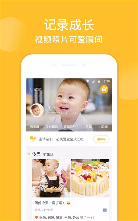 - 家庭共享功能:邀请家人加入,共享宝宝的成长时刻,构建家庭之间的亲密关系,让每个家庭成员都参与到育儿过程中。