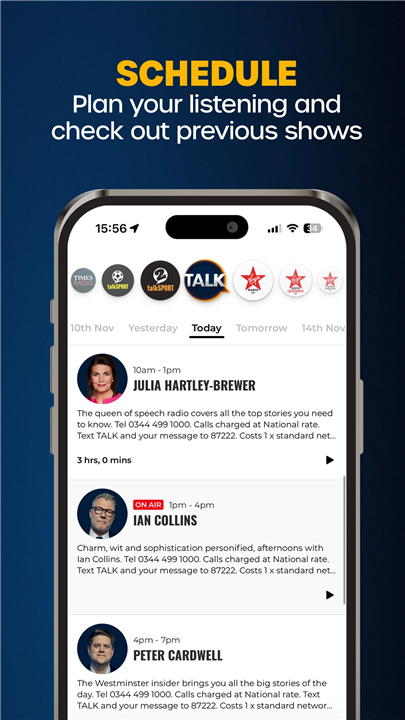 A: Talk features some of the most respected and outspoken broadcasters in the country. Julia Hartley-Brewer is sharp, fearless, and unafraid to challenge any argument. Ian Collins offers balanced, insightful perspectives and handles diverse opinions with care. Jeremy Kyle brings a direct and often confrontational style that’s compelling to listen to. And Kevin O’Sullivan adds wit, informed commentary, and a bold voice to the mix. Each has their own unique approach, making for a varied and dynamic listening experience.