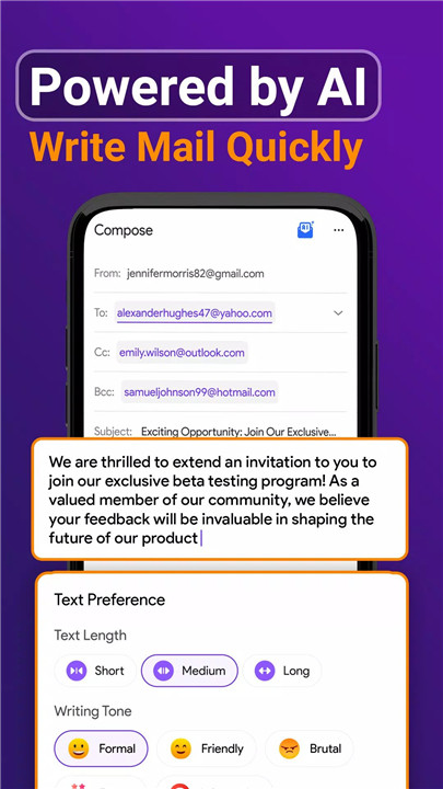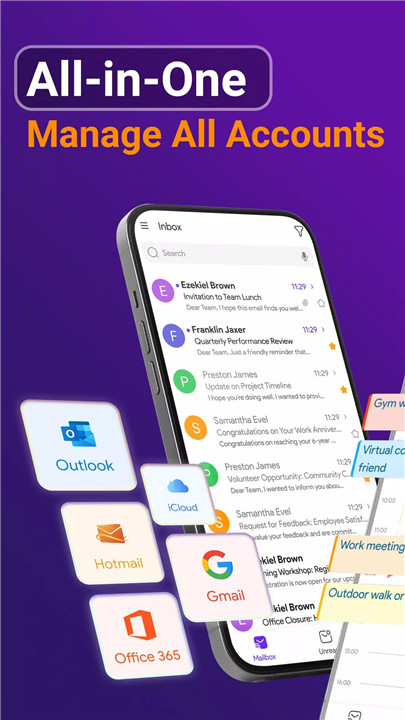 Managing multiple email accounts has never been simpler. Email & Calendar's intuitive interface allows you to effortlessly switch between accounts, keeping your inbox organized and free from clutter. Whether you're handling personal emails or professional correspondence, stay on top of everything with ease.