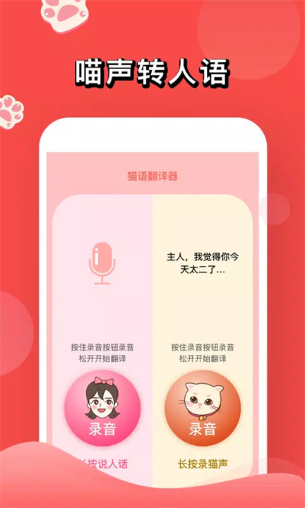 [人猫交流器]是一款帮助主人与猫咪沟通的有趣应用,能够将人的声音转化为猫语。通过对100多只猫咪的音频采样,应用精确分析并复述出猫咪的叫声,让主人更轻松地吸引猫咪的注意。内置猫叫音板,快速播放常见猫咪声音,增进与爱猫的互动。让你与猫咪之间的交流无障碍,享受更加亲密的关系。猫咪不理你?试试用猫语跟它说话吧!