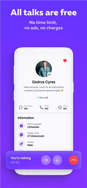 Enjoy the benefits of Speak Pal without any cost or intrusive ads. Focus solely on improving your English speaking skills without distractions.