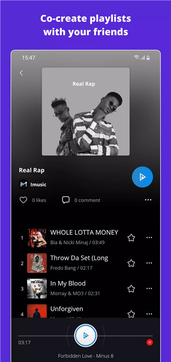 Quickly find songs, artists, or albums using intuitive search. Have your own music? Upload it directly to share with the IMUSIC community.