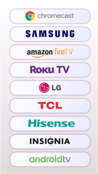 + Smart TVs: Roku TV, Fire TV, Samsung, LG, Sony, Vizio, Panasonic, TCL, Philips, Hisense, Huawei, Xiaomi, and more.