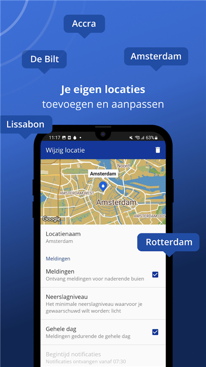 • Customize your experience by setting specific alerts for different intensities of weather.