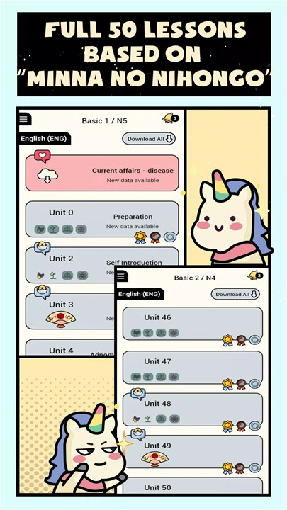 Choose from Basic 1/N5 (covering hiragana, katakana, Unit 1 to Unit 25) and Basic 2/N4 (covering Unit 26 to Unit 50) courses tailored to your proficiency level.