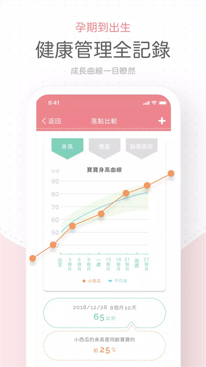 记录宝宝身高、体重、头围的变化,自动与标准曲线对比,轻松掌握宝宝成长状态。再也不担心错过宝宝的小变化!