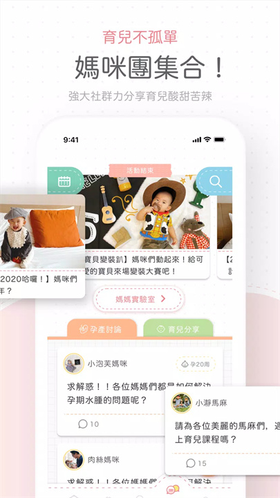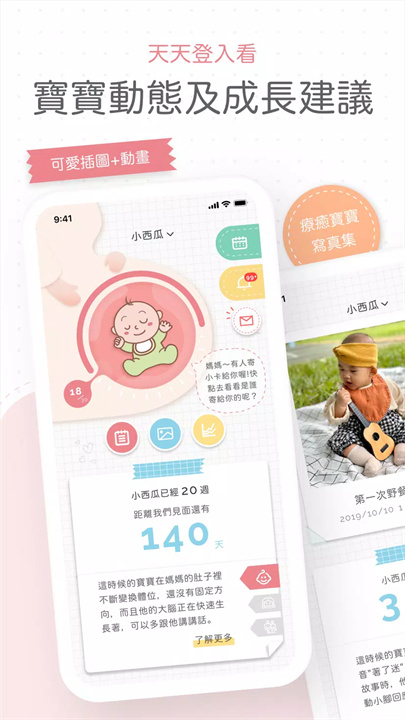 提供孕期健康管理、宝宝成长记录、亲子日记、行事历、育儿知识、妈妈社群等功能。