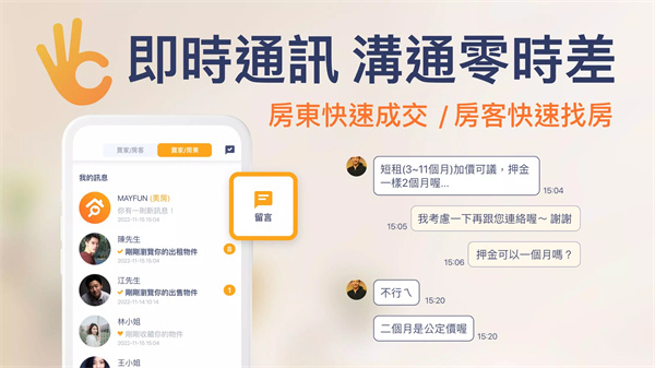 无论是租客还是房东,通过即时通讯功能,快速联系,解决疑问,达成交易。