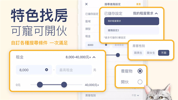一目了然的物件列表,清晰的标签分类,轻松筛选符合自己条件的房源。你可以使用多组自定义条件筛选,随时找到合适的房子。