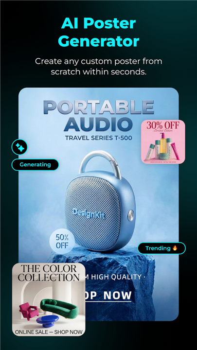 • Automated Generation: Simply provide a single request, and Designkit's AI intuitively understands your product and style, delivering a complete visual suite.
