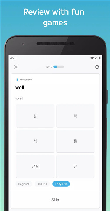 Engage in various fun games to listen, write, practice, and reinforce your Korean vocabulary. From listening exercises to writing challenges, Avocards offers a dynamic learning experience.