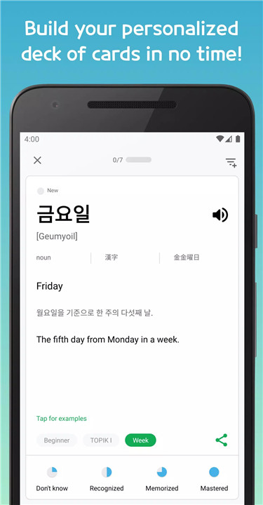 Each Korean flashcard comes with multiple example sentences, dictionary definitions, and audio recordings by native speakers, ensuring you grasp word meanings and pronunciation accurately.