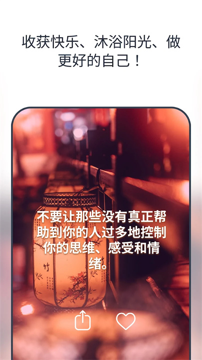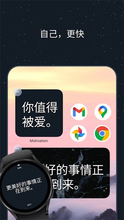 这款应用旨在为您提供积极的励志金句,帮助用户在逆境中找到动力或与朋友分享。用户可以自定义主屏幕控件,获取全天候的励志提醒,支持按类别浏览数千条金句,例如健身、爱情和自尊等主题。
