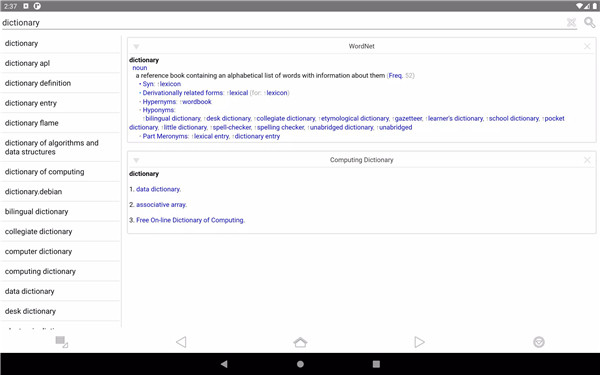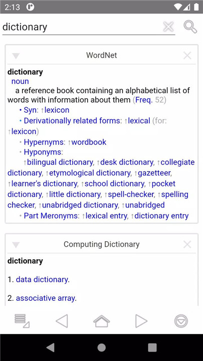 · Full-text search: Scans all dictionary content, including definitions and examples.