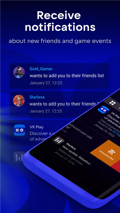 Notifications: Stay updated with notifications from your favorite VK Play games and services. Be the first to know about unique game promos, new friends, and gifts, keeping you engaged and informed.