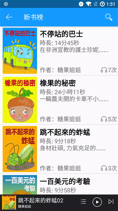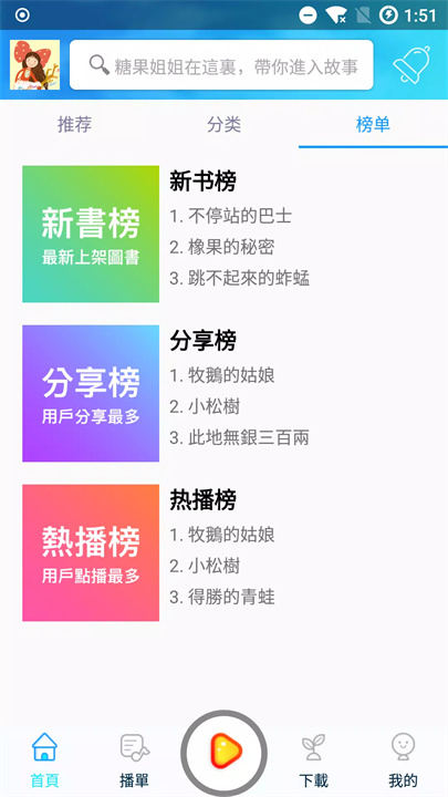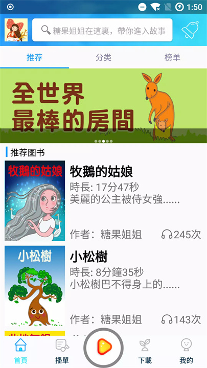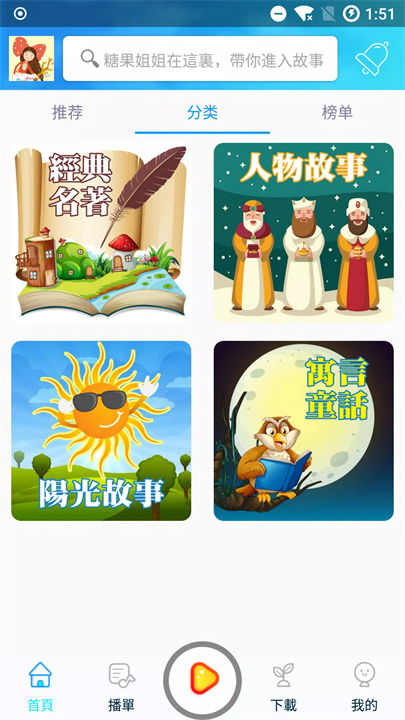 包括《人物故事》、《经典名著》、《寓言童话》和《阳光故事》四大类,内容涵盖历史人物、经典文学作品、寓教于乐的童话等,适合各个年龄段的孩子。