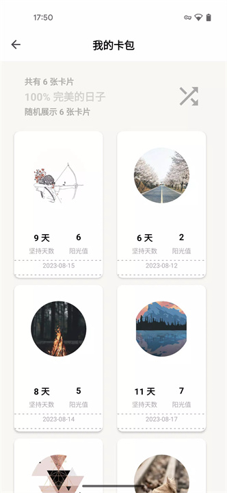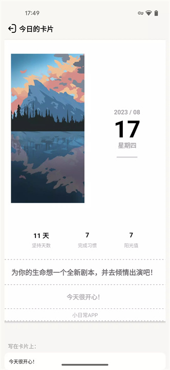 完成任务后,您将获得一张今日卡片,可以记录当天的心情和感想,激励自己继续前行。
