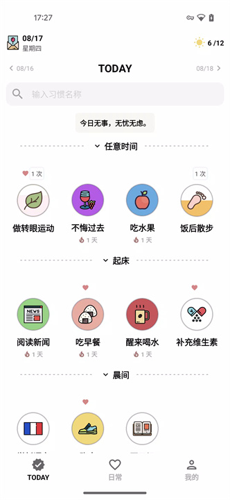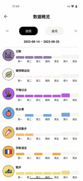 只需提前设置好每周的任务安排,点击相应的习惯,轻松完成日常打卡。每天坚持一点点,积累起大大的改变。