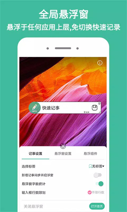 悬浮窗可以悬浮于任何App上层,支持自定义悬浮窗图标颜色、透明度等设置,用户可以快速记录而无需切换应用。