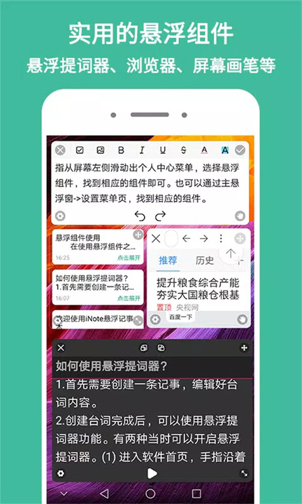 iNote内置多个悬浮组件。比如可以单独悬浮一个记事,直接在悬浮窗里编辑,不打开App也能完成记录。还可以悬浮浏览器、提词器等,满足多任务操作需求。