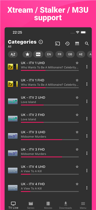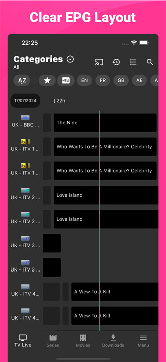 Automatically organizes your playlists into Live TV, Series, and Movies for seamless navigation.