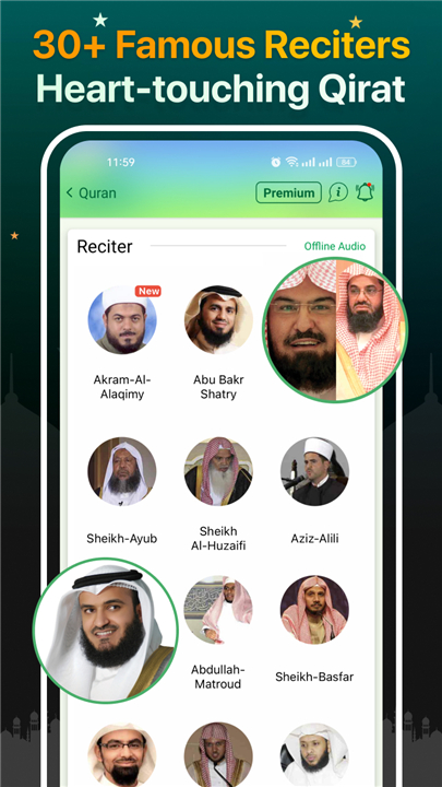 • Recitations by world-renowned Qaris such as Sheikh Abdul Basit, Sheikh As-Sudais, Mishari Rashid, Saad Al-Ghamdi, and many others