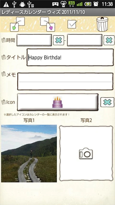 • Fill in: Title, Memo, Icon, Date, Time, Week, Which Week, End of Month, Specified Day, Month, Alarm