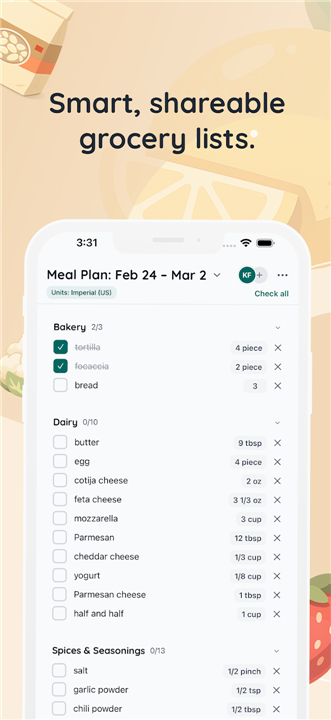 • Generate automated grocery lists directly from your recipes or weekly plans.