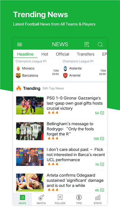 • Follow the latest updates on football icons like Ronaldo, Messi, Haaland, and Mbappe.