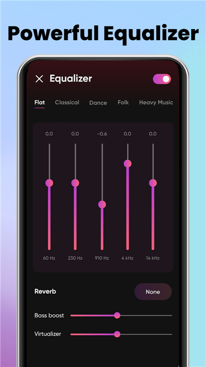 A: Absolutely! You can fine-tune your listening experience using the professional equalizer. Choose from presets like Rock, Jazz, or Pop, or create your own custom sound profile. You can also enhance the audio with our bass boost and 3D virtualizer effects for a richer, more immersive sound.