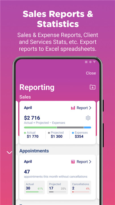 Monitor your business performance with detailed sales and expense reports. MASTERS offers in-depth statistics on client visits, trending services, and more, empowering you to make data-driven decisions for business growth. You can easily export these reports to Excel for further analysis or record-keeping, simplifying the management of your finances and tracking of trends.