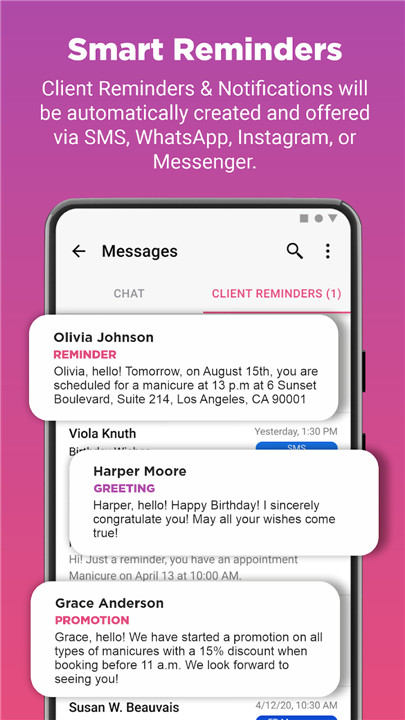 Keep your appointments in check with intelligent reminders and notifications. MASTERS automatically sends reminders to both you and your clients through various communication channels, such as SMS/iMessage, WhatsApp, Telegram, or email. This functionality minimizes the chances of no-shows and helps maintain a consistent flow of appointments, ensuring your business operates seamlessly.