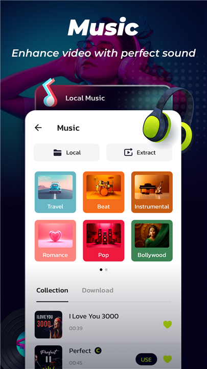 • Choose from a wide selection of online music in genres like pop, romance, and festive tunes, or upload your own tracks to personalize your video.