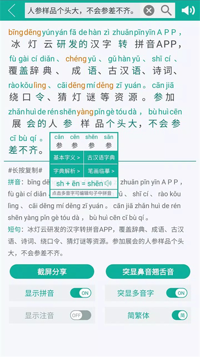 汉字转拼音:输入汉字或拍照识字,应用会自动显示带声调的拼音或注音符号,支持单字、词语、句子的发声,帮助学习发音。