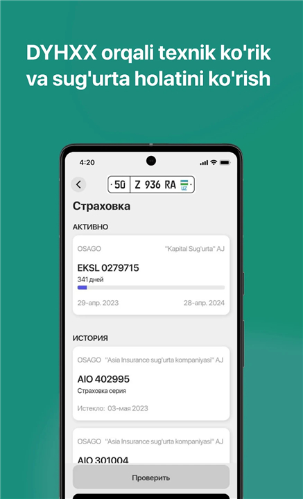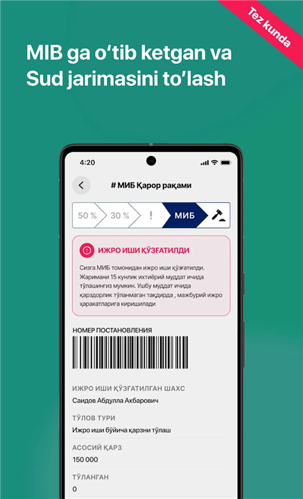 • Search fines using the vehicle’s license plate number and technical passport series, along with the PINFL (personal identification number from passport).