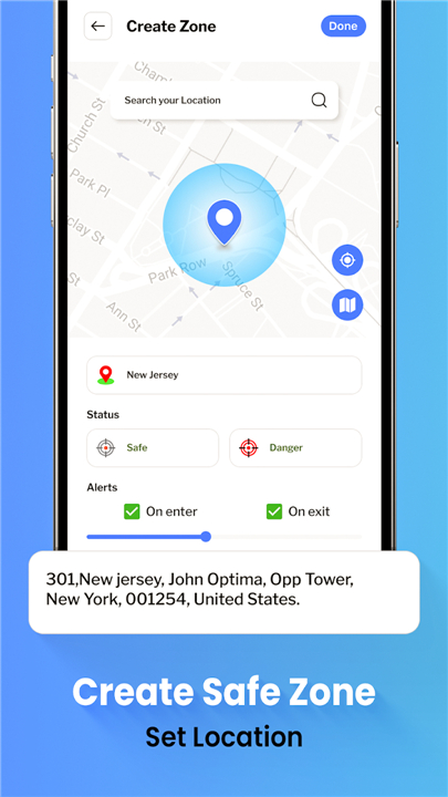 • You can designate custom safe zones such as schools, workplaces, or residential areas and receive immediate push notifications when a tracked user enters or exits these premises.