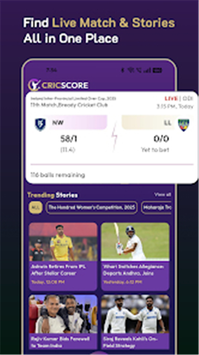 • Download CricScore and transform the way you experience cricket—every run, every wicket, every legendary moment.