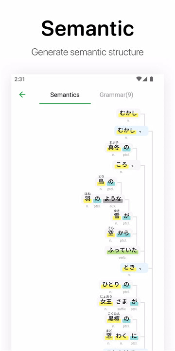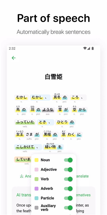 - Part of Speech Analysis: Automatically break down sentences and paragraphs, marking parts of speech and pronunciations of kanji, to enhance your reading efficiency.