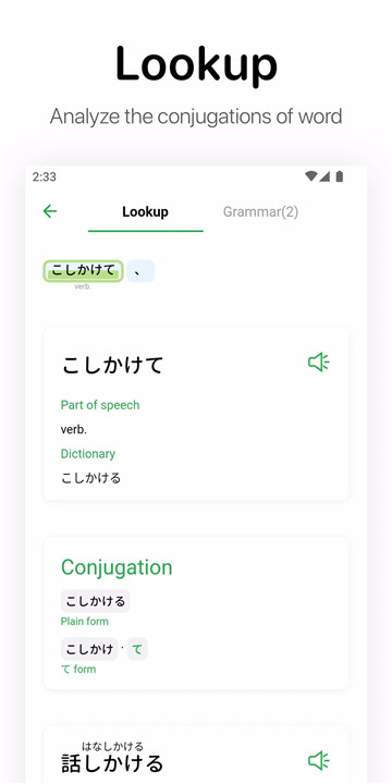 - Word parsing: Automatically analyze word conjugations using the built-in dictionary for a deeper understanding.