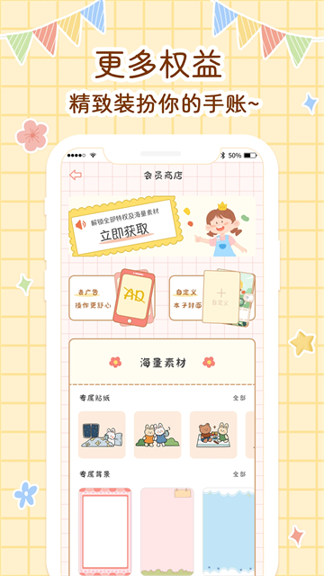 提供了海量贴纸、信纸、封面等素材,支持不同主题的创作,如可爱兔子、哥特风格、魔法学院等,帮助你根据心情或主题,设计个性化的手帐页面。