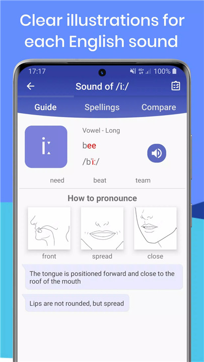 - British and American Accent Practice: Practice English pronunciation with real British or American accent voices, including over 8,000 minimal pairs for comparison.