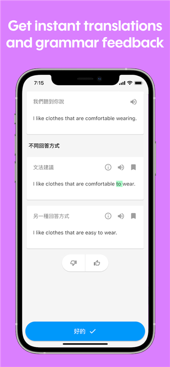 • Receive instant grammar tips and alternative phrasing suggestions the moment you speak.