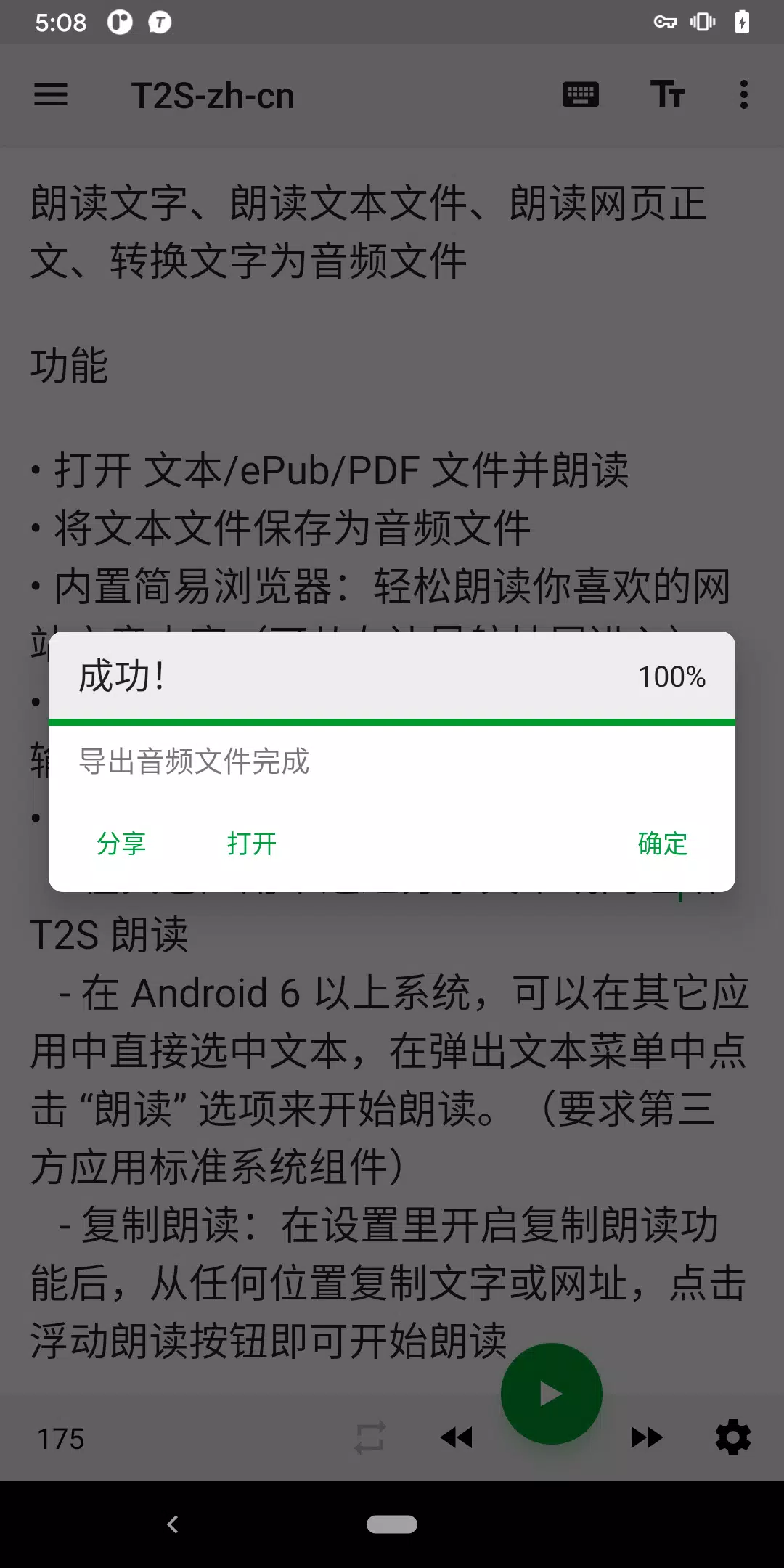 T2S 还能和其他应用联动,在其他软件中选中文本,分享到 T2S 就可以朗读出来,跨应用使用也无缝衔接!
