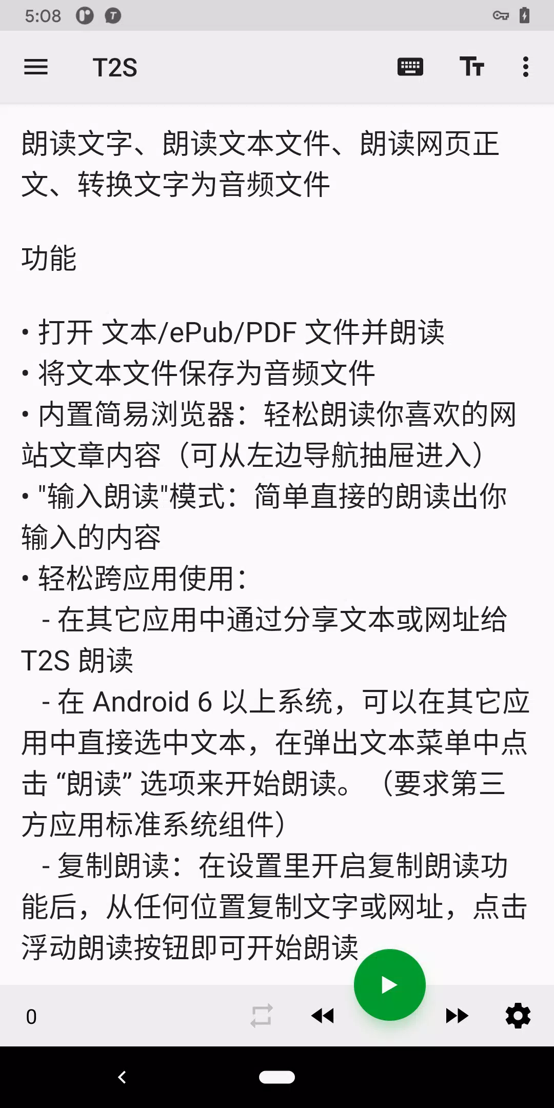 T2S是一款将文字转化为语音的应用,可以朗读文本文件、网页文章、电子书等内容,支持音频转换和多种操作方式,方便用户随时随地“听”文字。